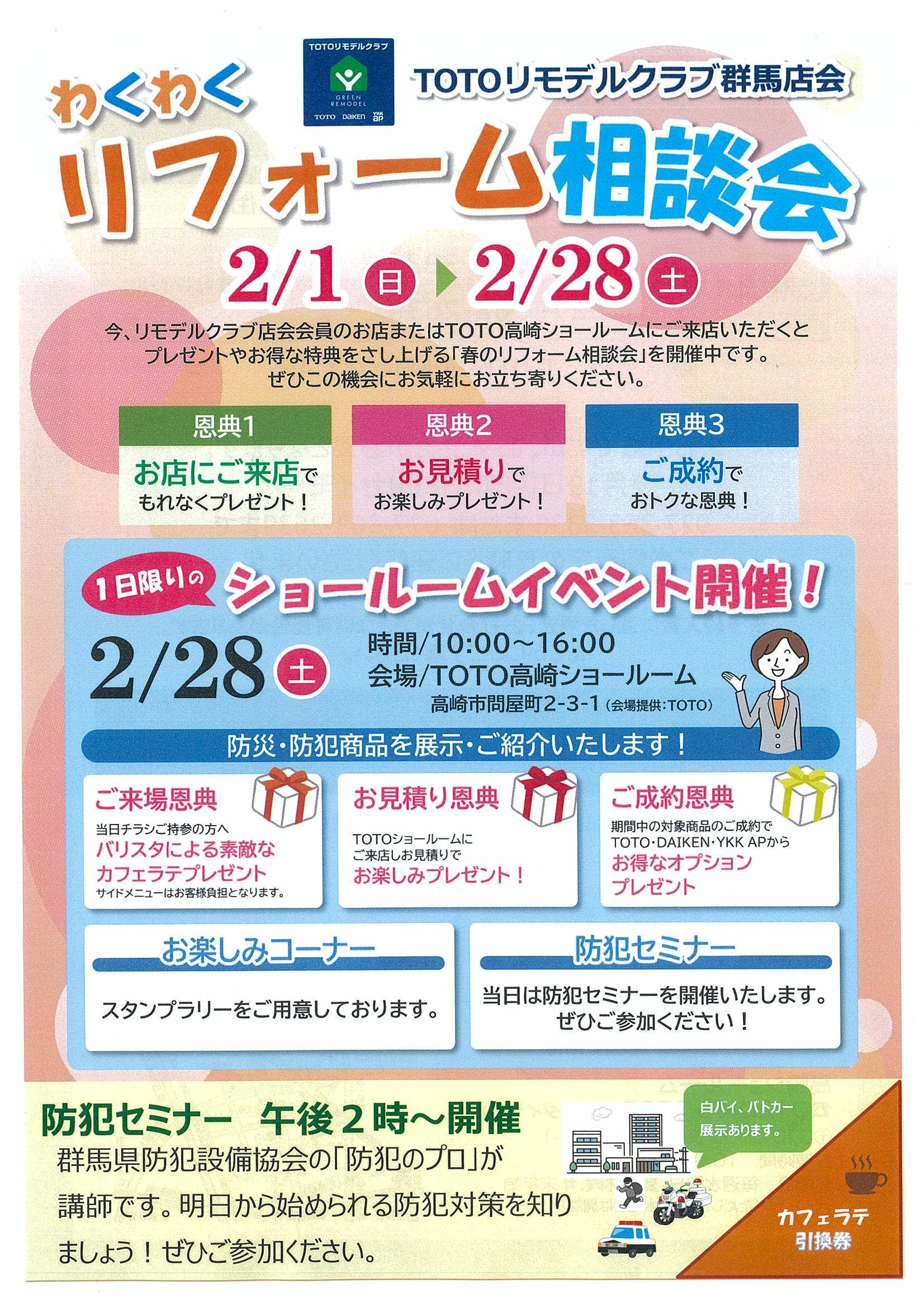 開催時間/10:00-16:00 開催場所/TOTO高崎ショールーム